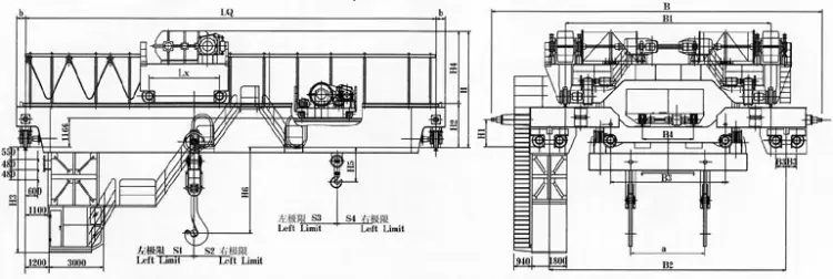 The YZS type adopts the structure of main and auxiliary double trolleys, four girders and four rails. It is mainly composed of bridge frame, main trolley, auxiliary trolley, hook beam, trolley operation and electrical parts. The inner sub-beam track runs on the main trolley, and the pick-up device of the main trolley is a hook beam with a fixed distance, which is used to lift the ladle. To dump molten steel, steel slag and other auxiliary lifting operations.
